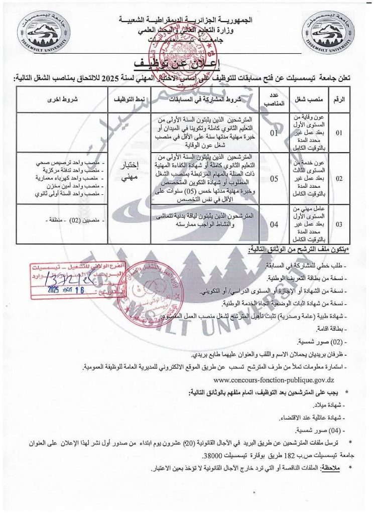 تعلن جامعة تيسمسيلت عن فتح مسابقات للتوظيف على أساس الإختبار المهني لسنة 2025 للإلتحاق بمناصب الشغل التالية: