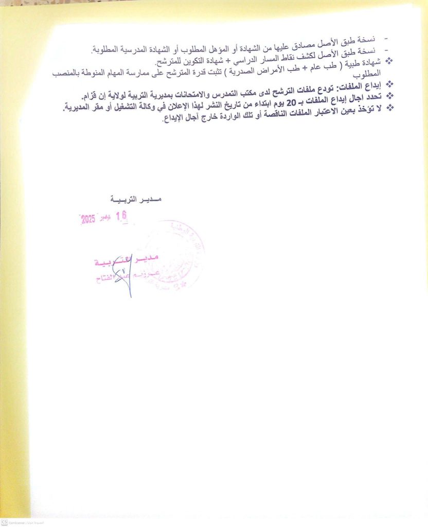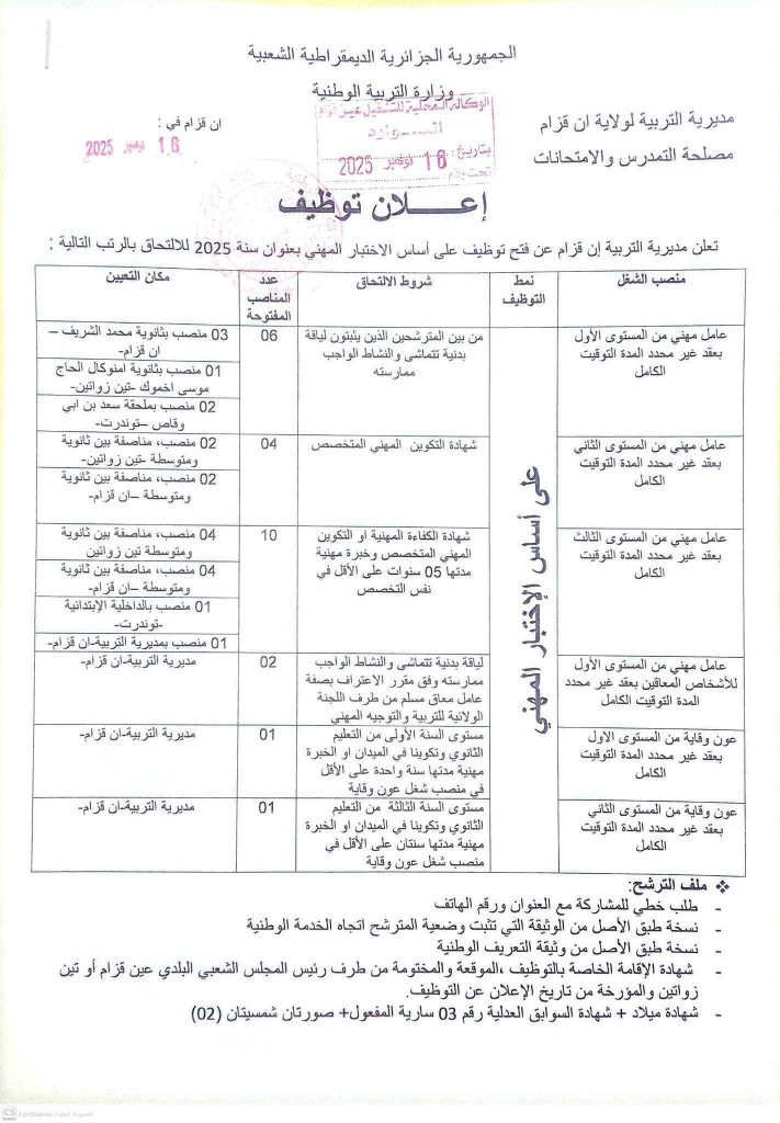 تعلن مديرية التربية لولاية إن قزام عن فتح توظيف على أساس المسار المهني بعنوان سنة 2025 للالتحاق بالرتب التالية: