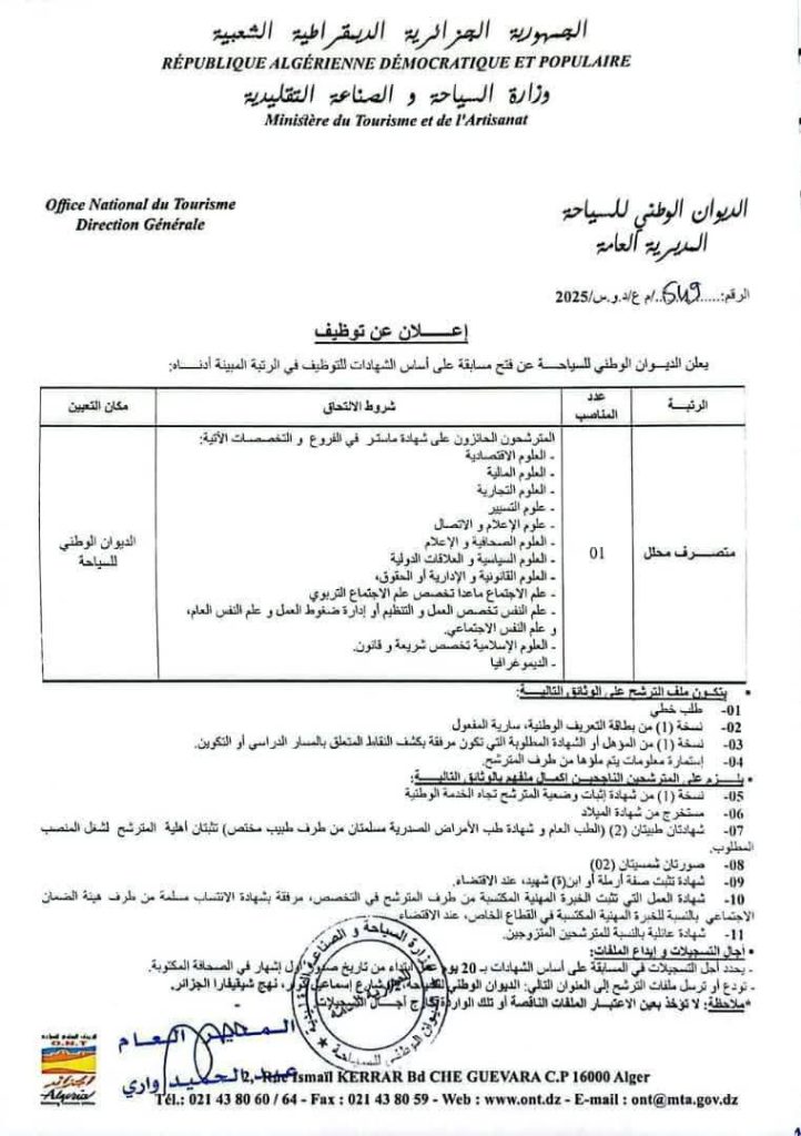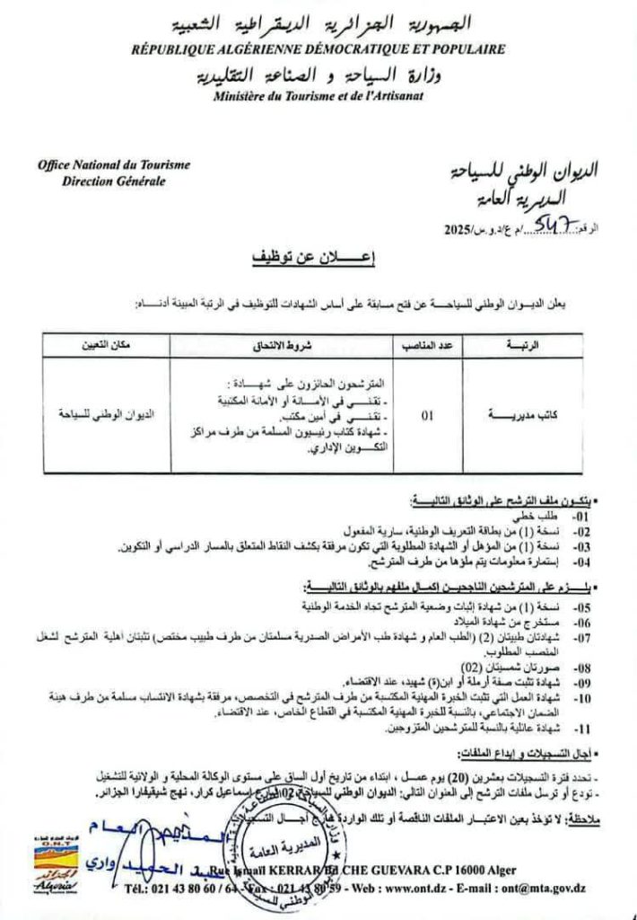 يعلن الديوان الوطني للسياحة عن فتح مسابقة على أساس الشهادات للتوظيف في الرتبة المبينة أدناه:
