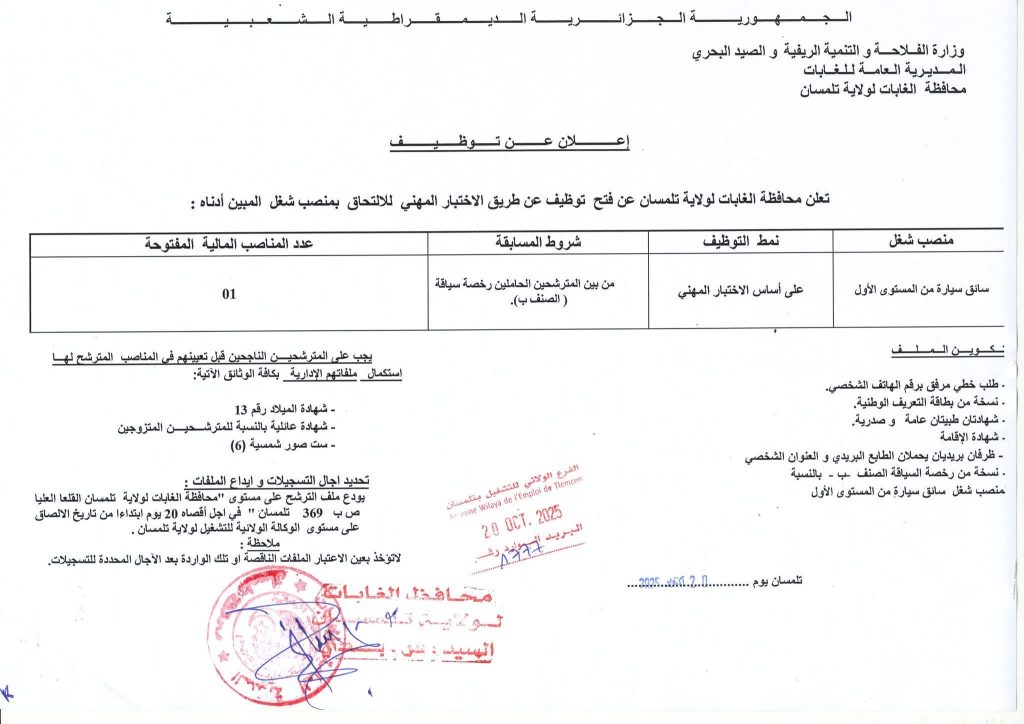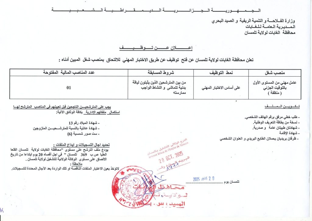 تعلن محافظة الغابات لولاية تلمسان عن فتح توظيف عن طريق الاختبار المهني للالتحاق بمنصب شغل المبين أدناه: