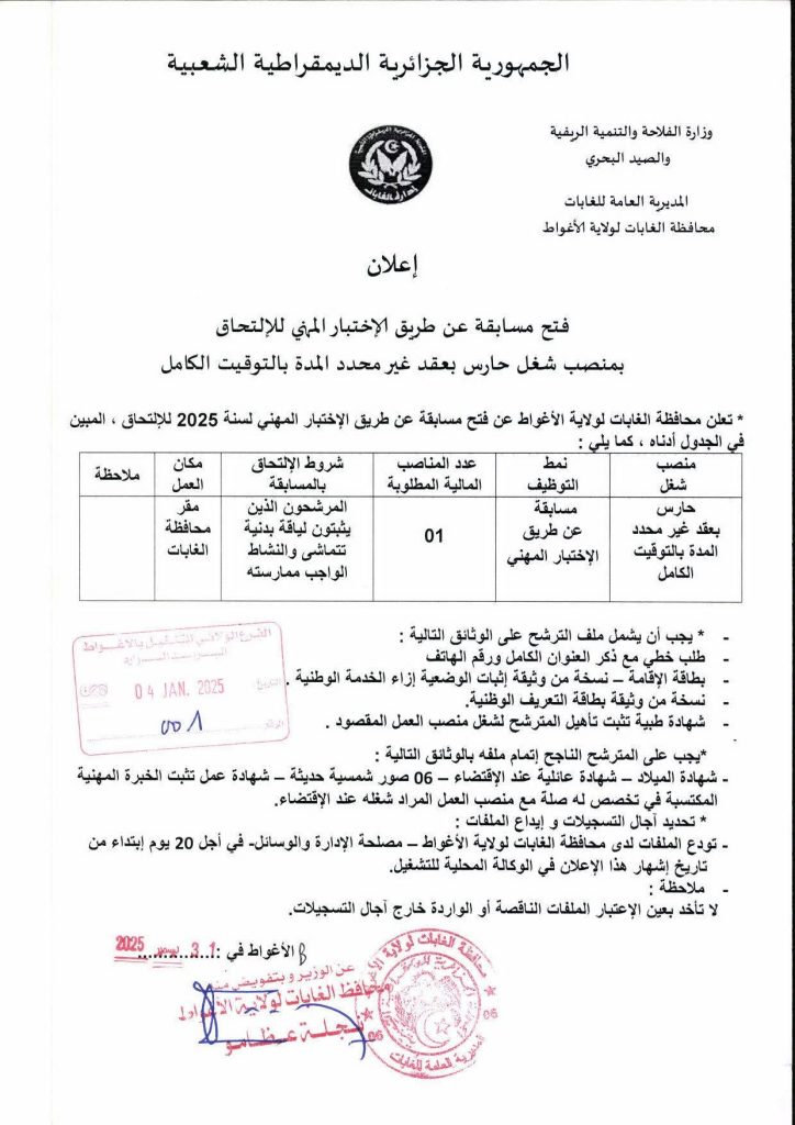 تعلن محافظة الغابات لولاية الأغواط عن فتح مسابقة عن طريق الاختبار المهني لسنة 2025 للالتحاق، المبين في الجدول أدناه، كما يلي: