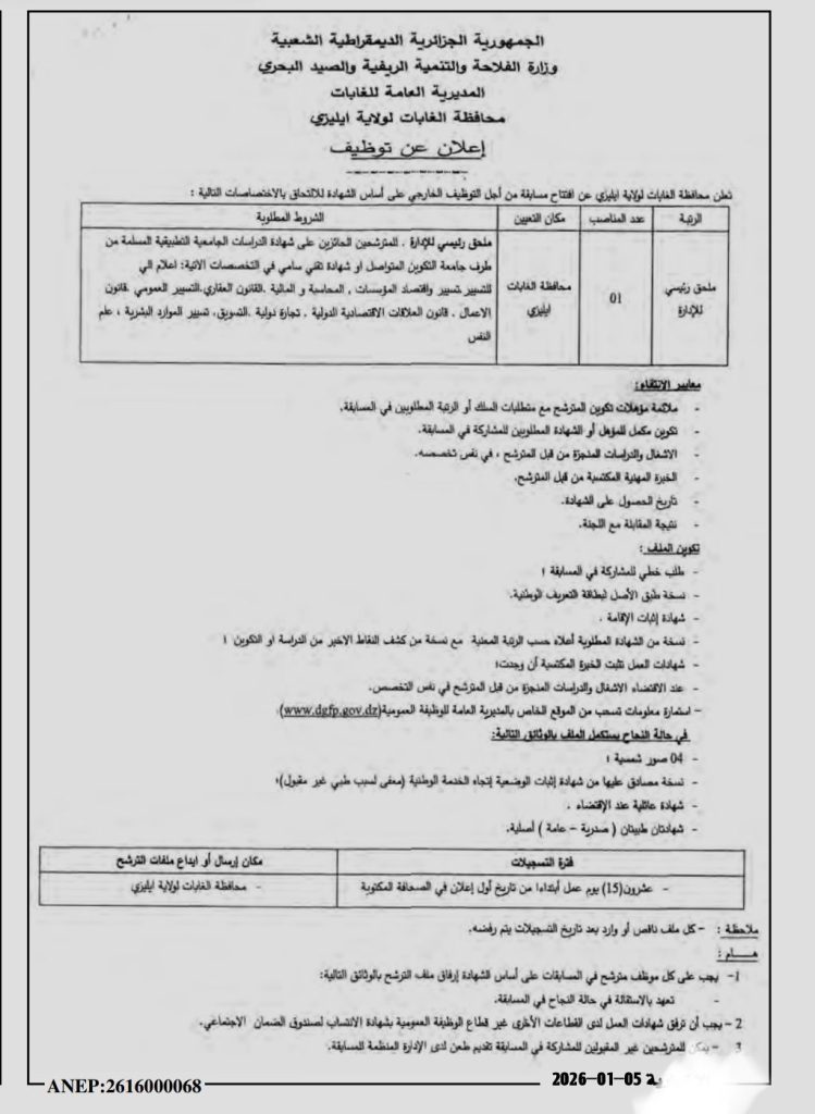 | ملحق رئيسي للإدارة | 01 | محافظة الغابات إليزي | ملحق رئيسي للإدارة، للمترشحين الحائزين على شهادة الدراسات الجامعية التطبيقية المسلمة من طرف جامعة التكوين المتواصل أو شهادة تقني سامي في التخصصات الآتية: إعلام آلي للتسيير، تسيير واقتصاد المؤسسات، المحاسبة والمالية، القانون العقاري، التسيير العمومي، قانون الأعمال، قانون العلاقات الاقتصادية الدولية، تجارة دولية، التسويق، تسيير الموارد البشرية، علم النفس. |