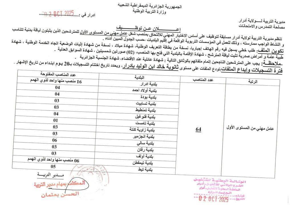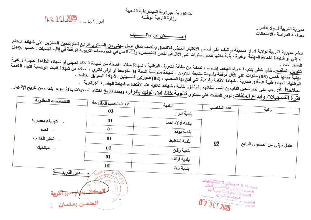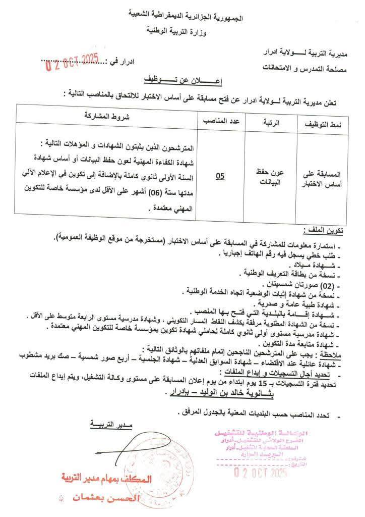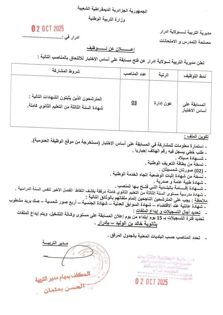 تعـلن مديرية التربية لولاية ادرار عن فتح مسابقة على أساس الاختبار للالتحاق بالمناصب التالية:
