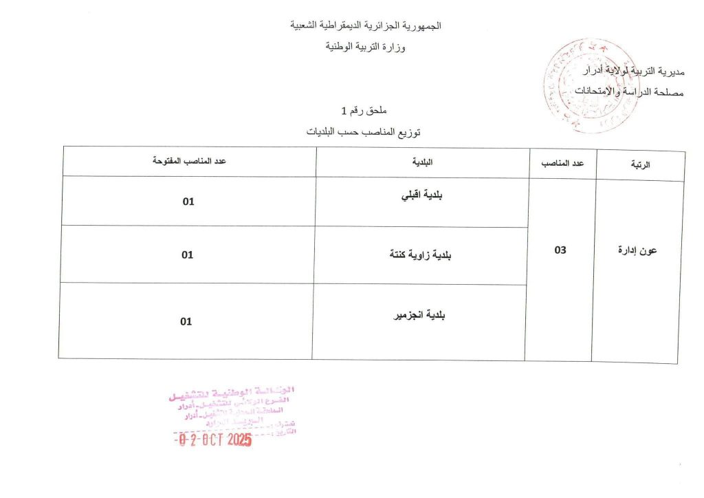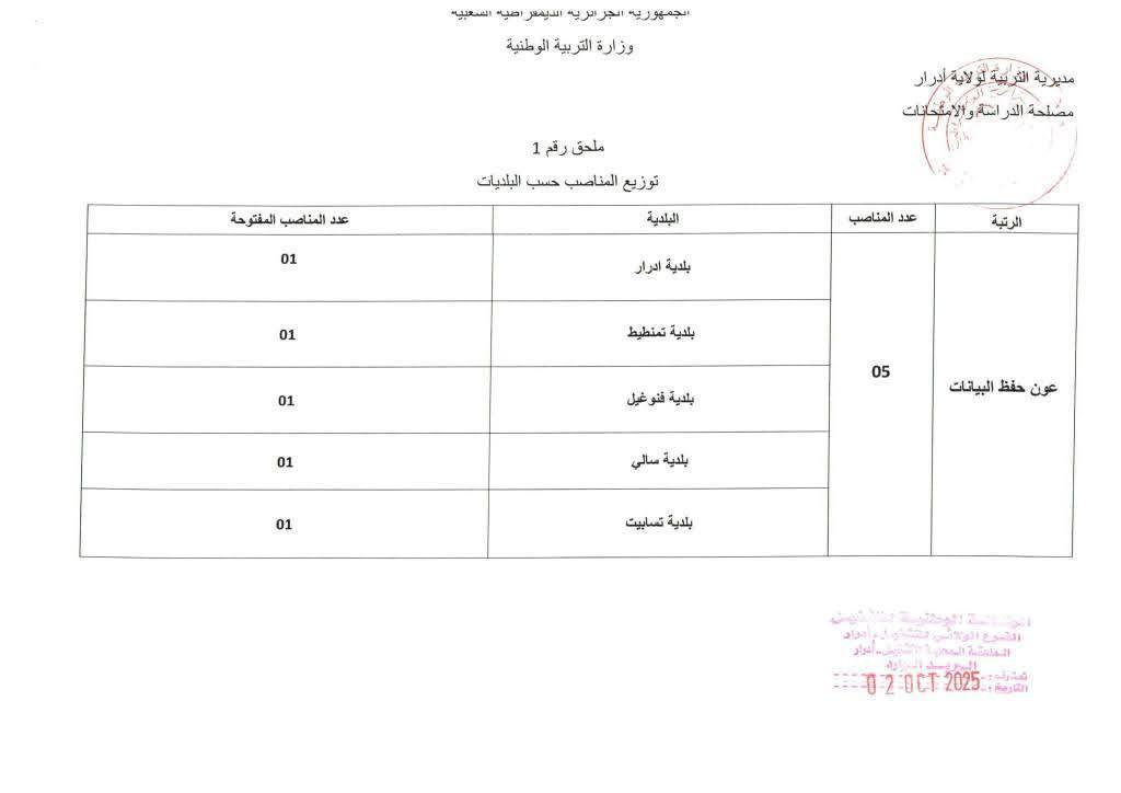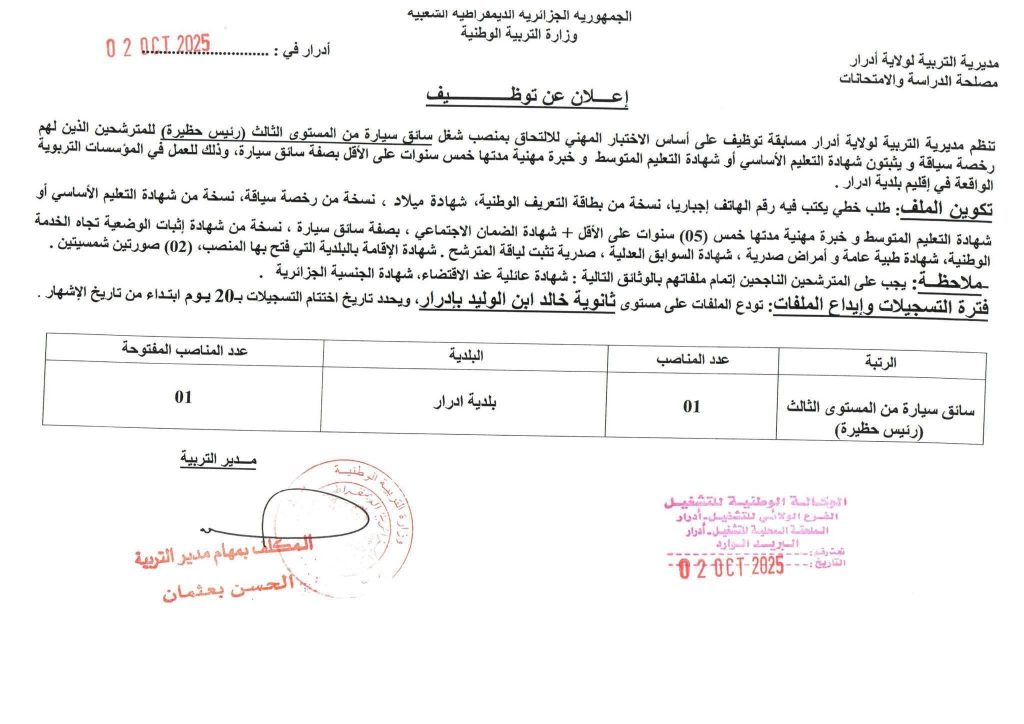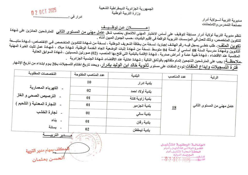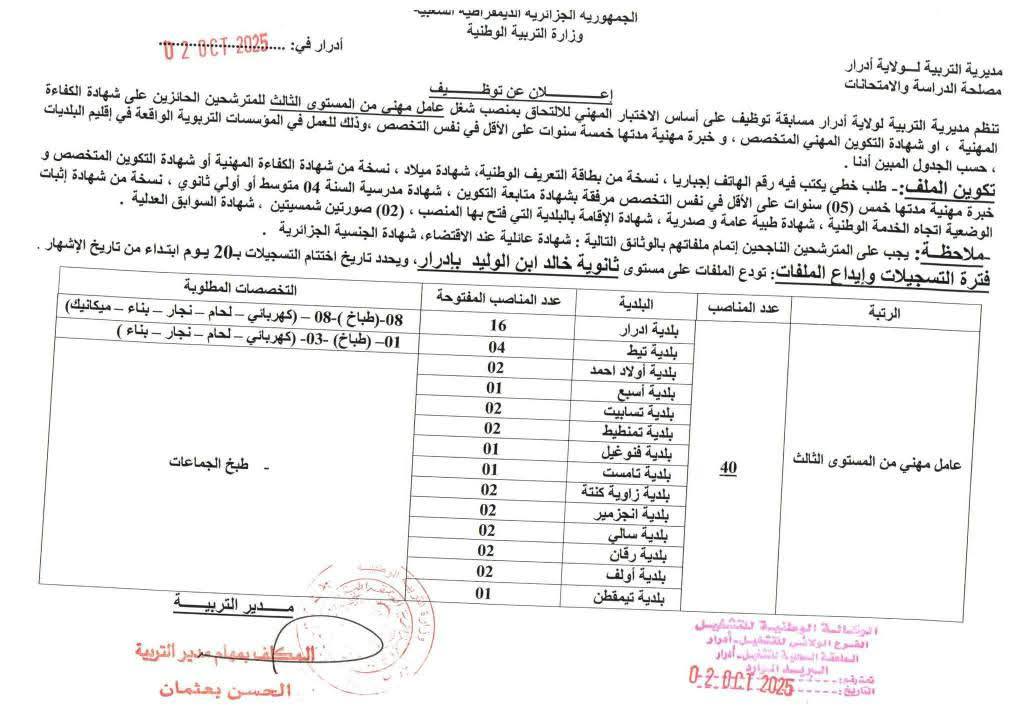 تعـلن مديرية التربية لولاية ادرار عن فتح مسابقة على أساس الاختبار للالتحاق بالمناصب التالية: