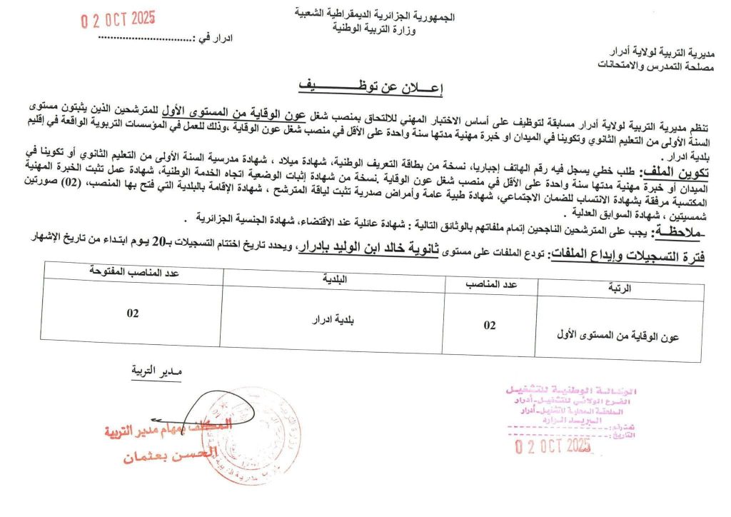 اعلان عن مسابقات توظيف بمديرية التربية لولاية أدرار (142 منصب)