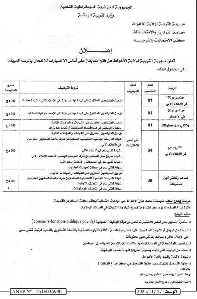 تعلن مديرية التربية لولاية الأغواط عن فتح مسابقة على أساس الاختبارات للالتحاق بالرتب المبينة في الجدول أدناه: