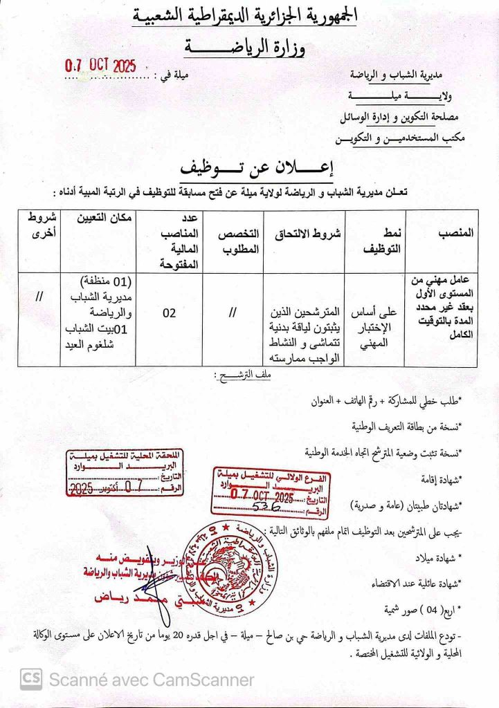 عامل مهني من المستوى الأول بعقد غير محدد المدة بالتوقيت المهني | على أساس الاختبار | المترشحون الذين يثبتون لياقة بدنية تتماشى و النشاط الواجب ممارسته | // | 02 | (01 متنقلة) مديرية الشباب و الرياضة 01 بيت الشباب شلغوم العيد | // |