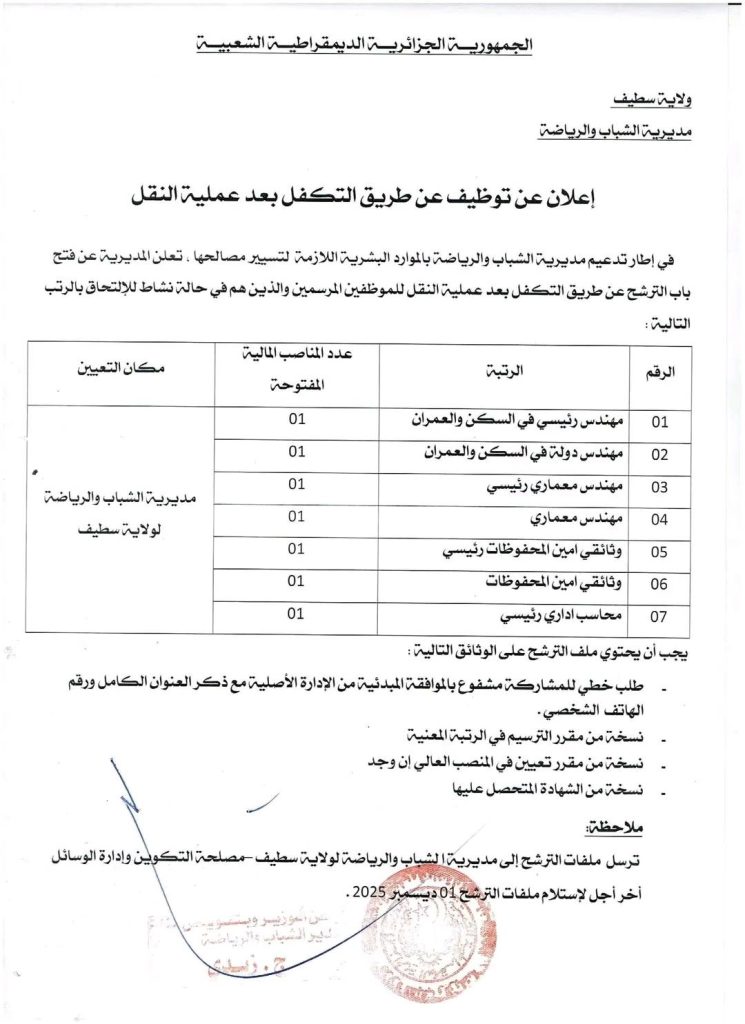 في إطار تدعيم مديرية الشباب والرياضة بالموارد البشرية اللازمة لتسيير مصالحها، تعلن المديرية عن فتح باب الترشح عن طريق التكفل بعد عملية النقل للموظفين المرسمين والذين هم في حالة نشاط للالتحاق بالرتب التالية: