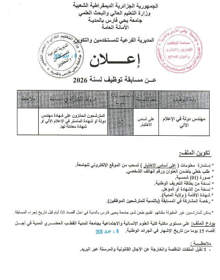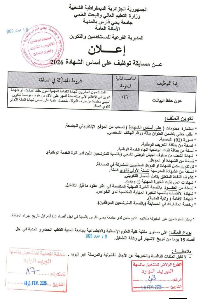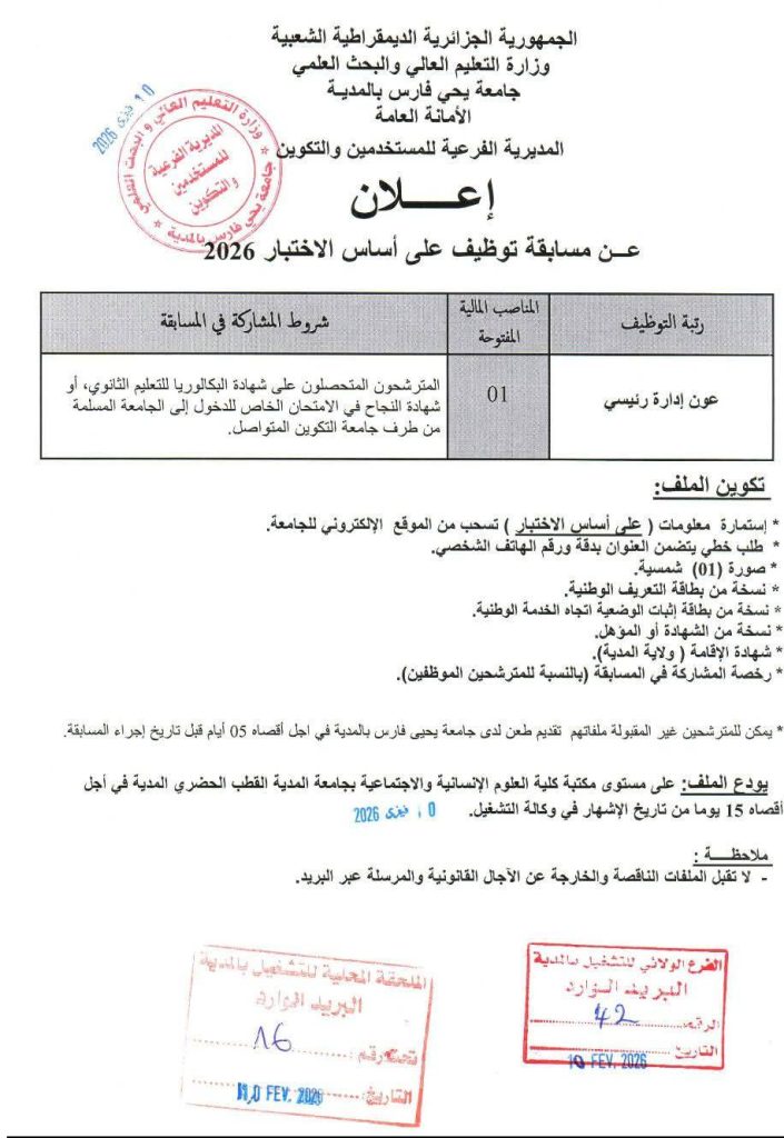 يودع الملف: على مستوى مكتبة كلية العلوم الإنسانية والاجتماعية بجامعة المدية القطب الحضري المدية في أجل أقصاه 15 يوما من تاريخ الإشهار في وكالة التشغيل. (التاريخ المختوم: 10 فيفري 2026).