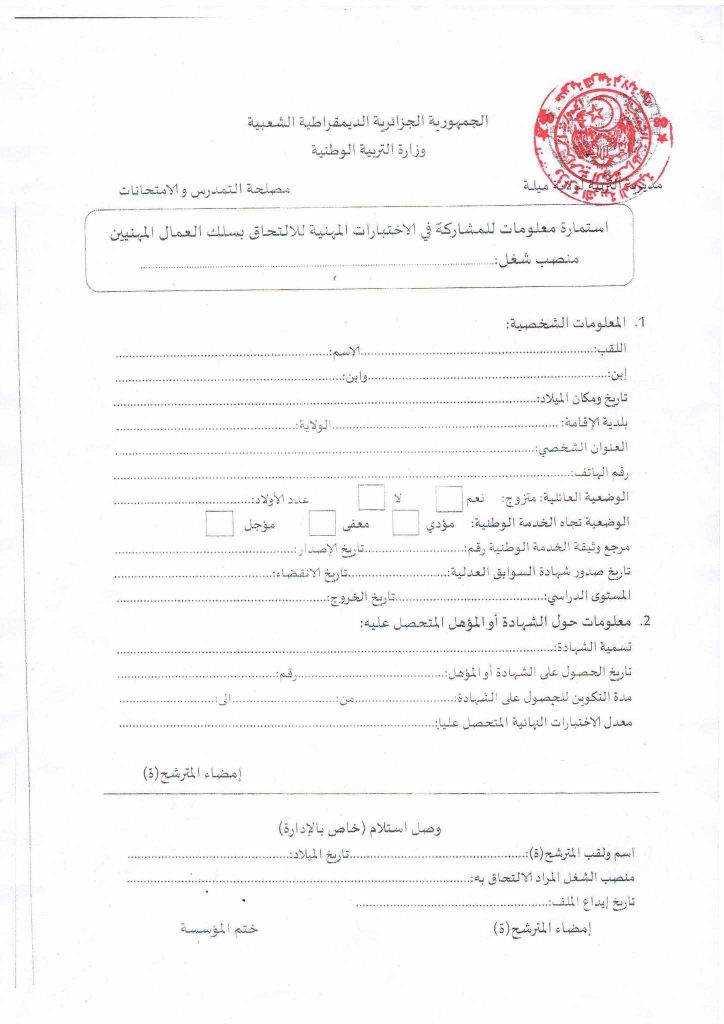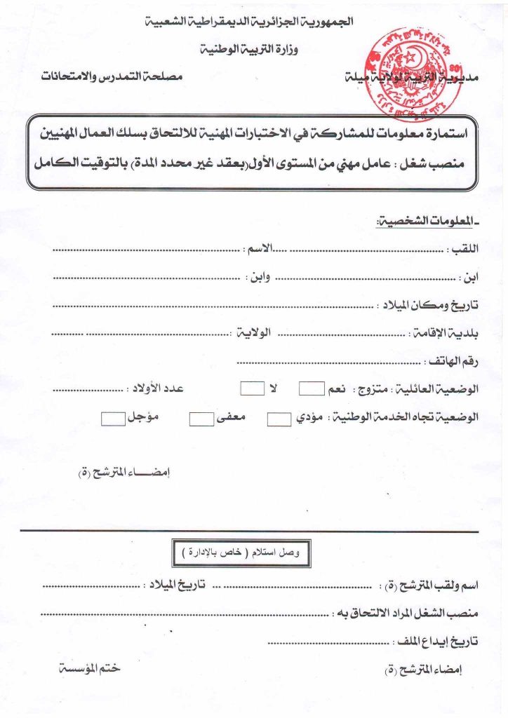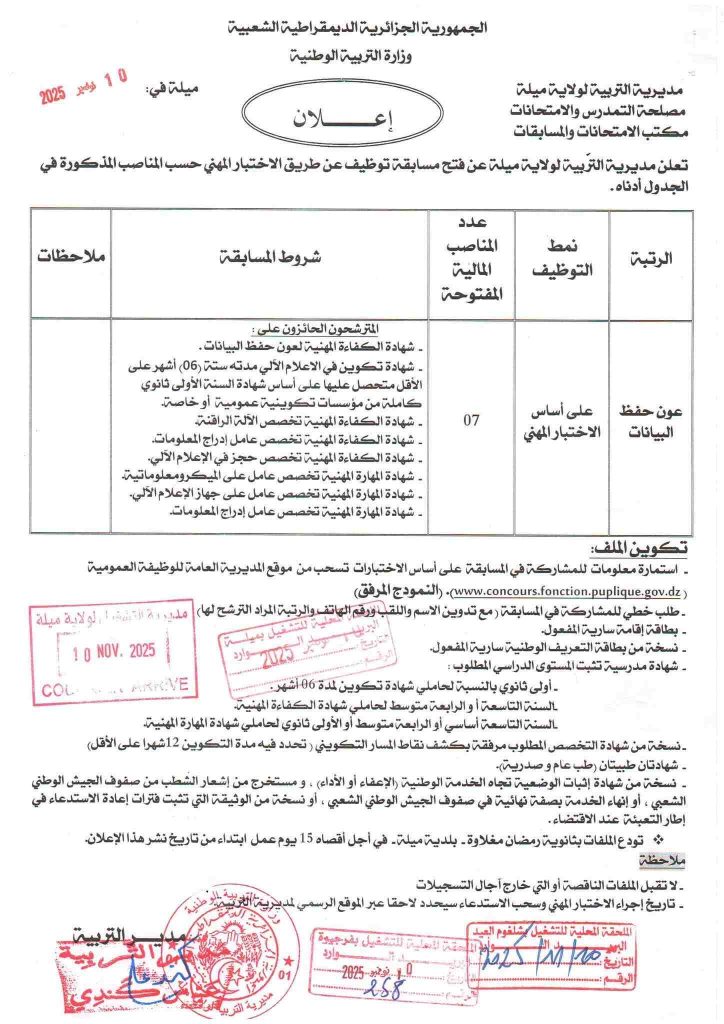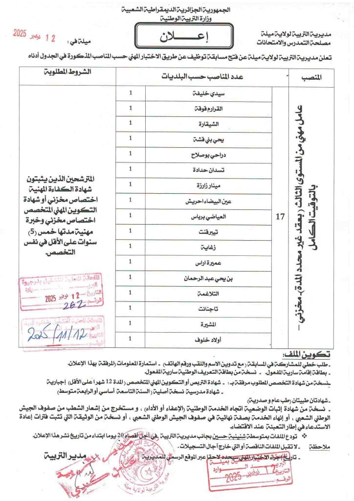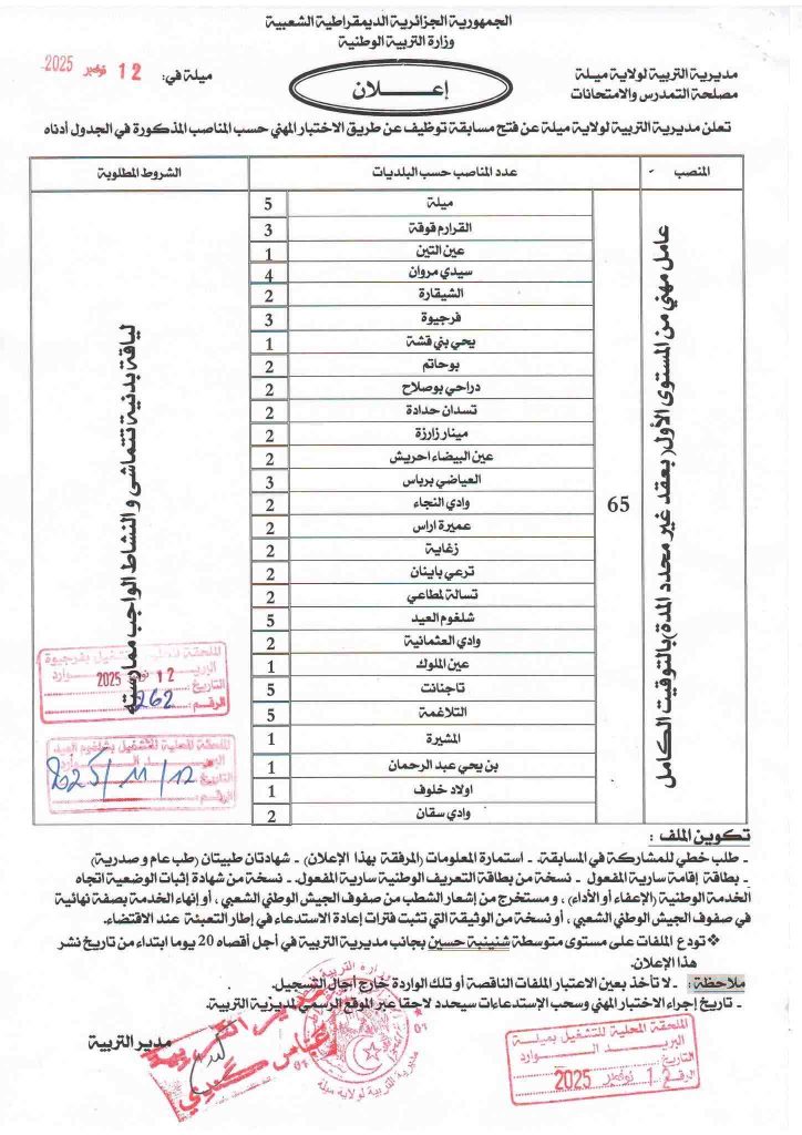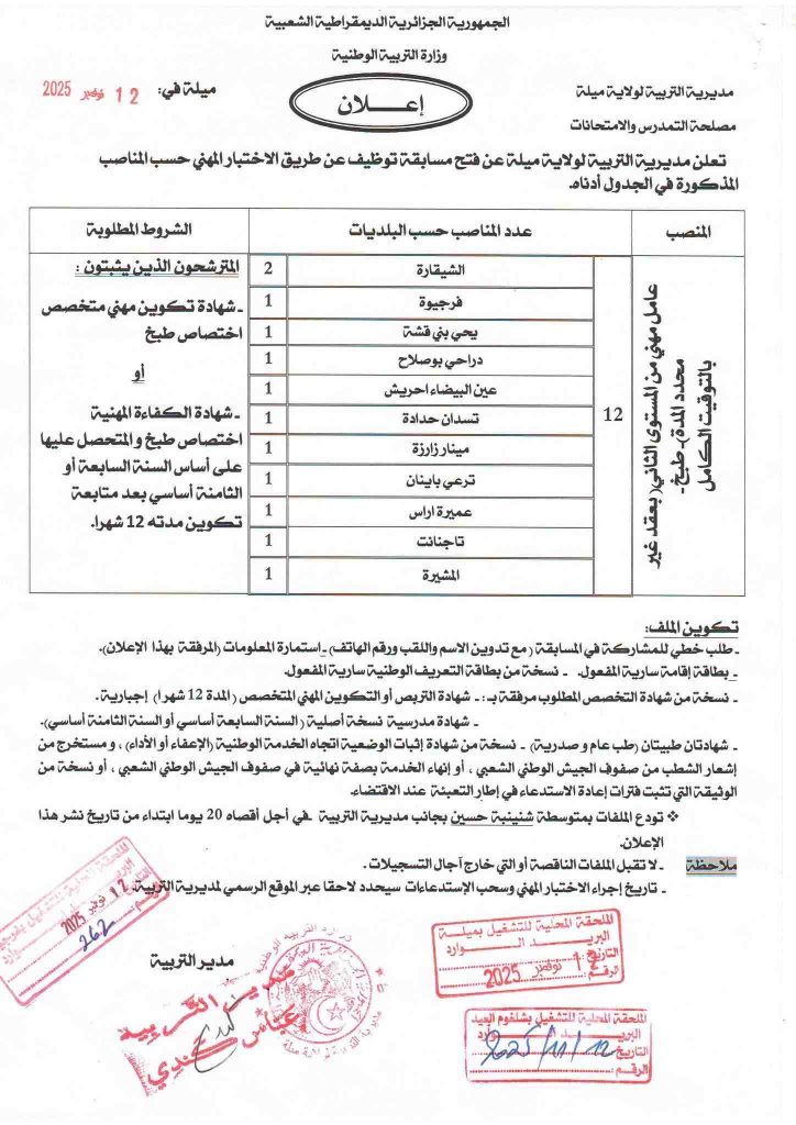 تعلن مديرية التربية لولاية ميلة عن فتح مسابقة توظيف عن طريق الاختبار المهني حسب المناصب المذكورة في الجدول أدناه