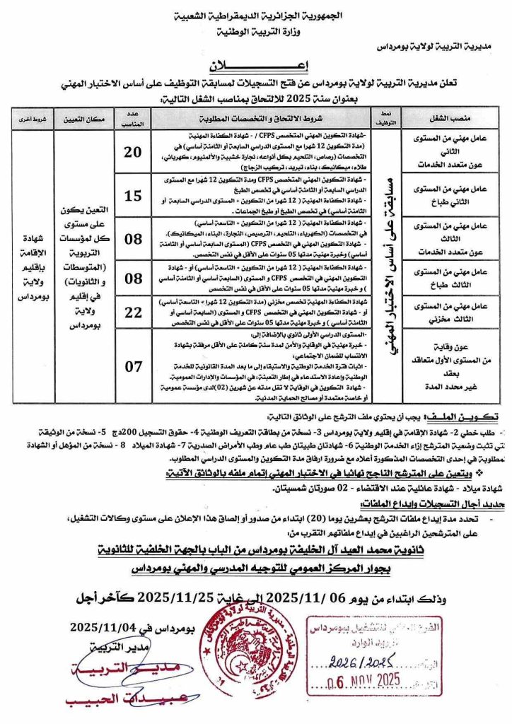 تعلن مديرية التربية لولاية بومرداس عن فتح التسجيلات لمسابقة التوظيف على أساس الاختبار المهني