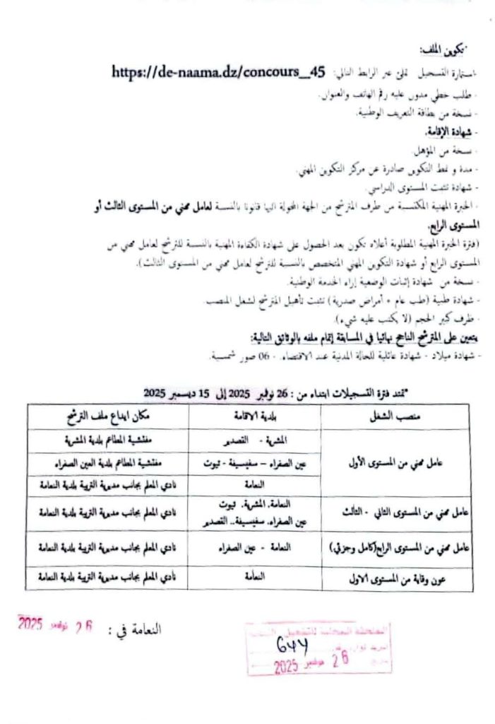 بمقتضى المرسوم الرئاسي رقم 07 – 308 المؤرخ في 29 سبتمبر 2007، والمتضمن كيفيات تسيير وتوظيف المستخدمين المكلفين بتسيير الموارد البشرية لسنة 2025، وبناء على مقررات الفتح رقم : 01 – 02 – 03 – 04 – 05 – 06 المؤرخة في 10 نوفمبر 2025 المتضمنة فتح مسابقة على أساس الإختبارات لتوظيف مناصب العمال المهنيين لمدة غير محددة بالتوقيت الكامل: 78 منصباً و بالتوقيت الجزئي منصب واحد (01).