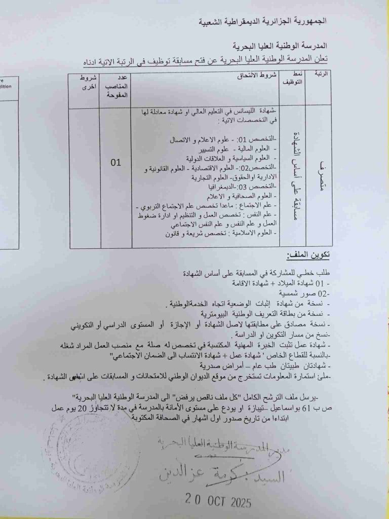 - اعلان عن مسابقة توظيف بالمدرسة الوطنية العليا البحرية