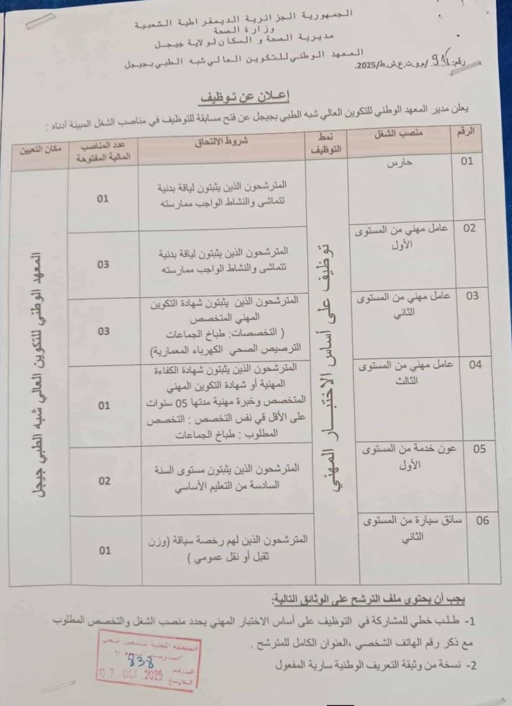 يعلن مدير المعهد الوطني للتكوين العالي شبه الطبي بجيجل عن فتح مسابقة للتوظيف في مناصب الشغل المبينة أدناه: