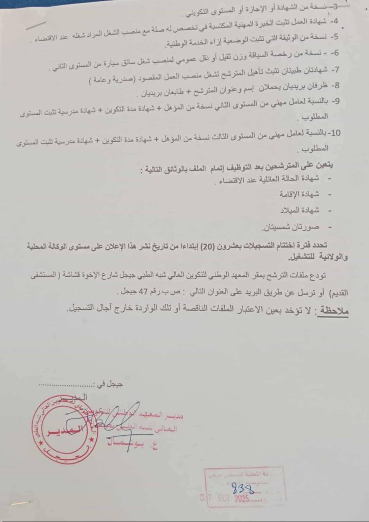 02 | عامل مهني من المستوى الأول | توظيف خارجي | المترشحون الذين يثبتون لياقة بدنية تتناسب و النشاط و الواجب ممارسته | 03 | المعهد الوطني للتكوين العالي شبه الطبي بجيجل |
