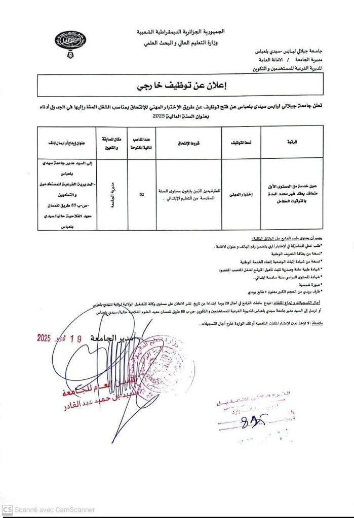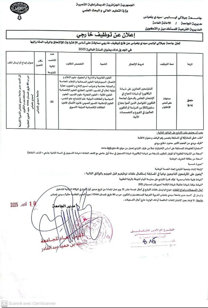 تعلن جامعة جيلالي اليابس سيدي بلعباس عن فتح توظيف على أساس الشهادة وعلىاساس الإختيار للإلتحاق بالرتب المشار إليها في الجدول أدناه بعنوان السنة المالية 2025