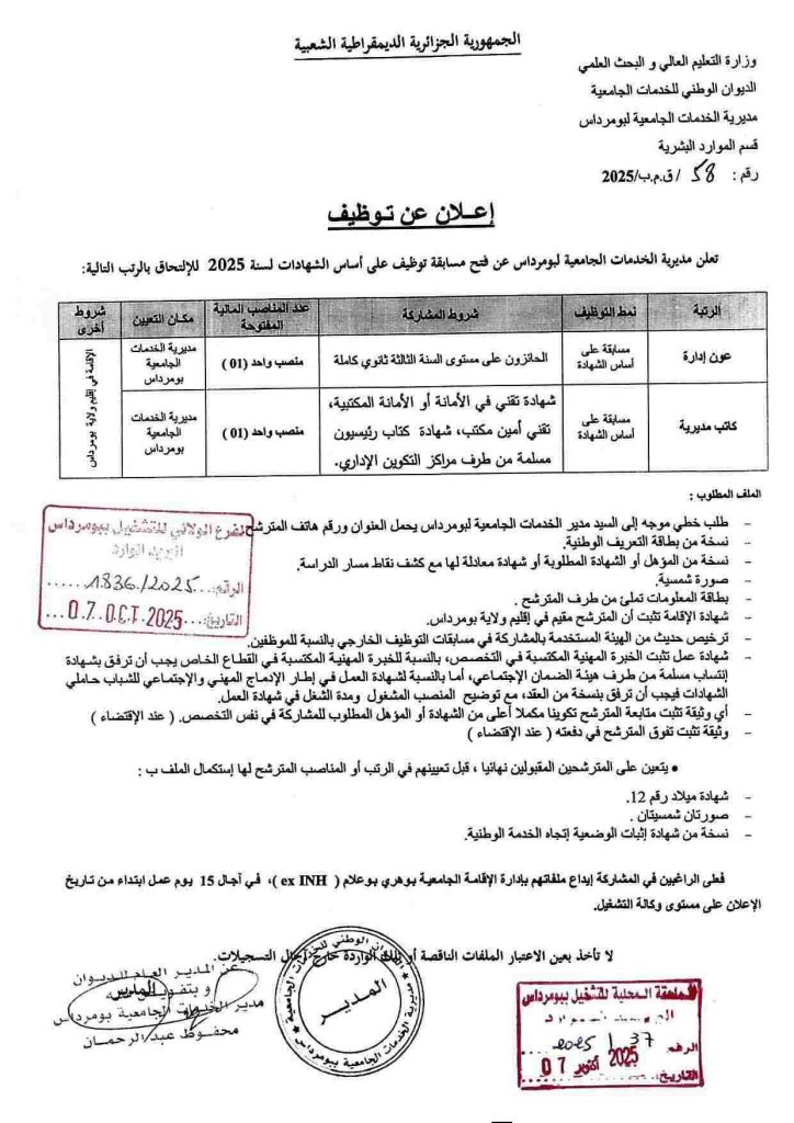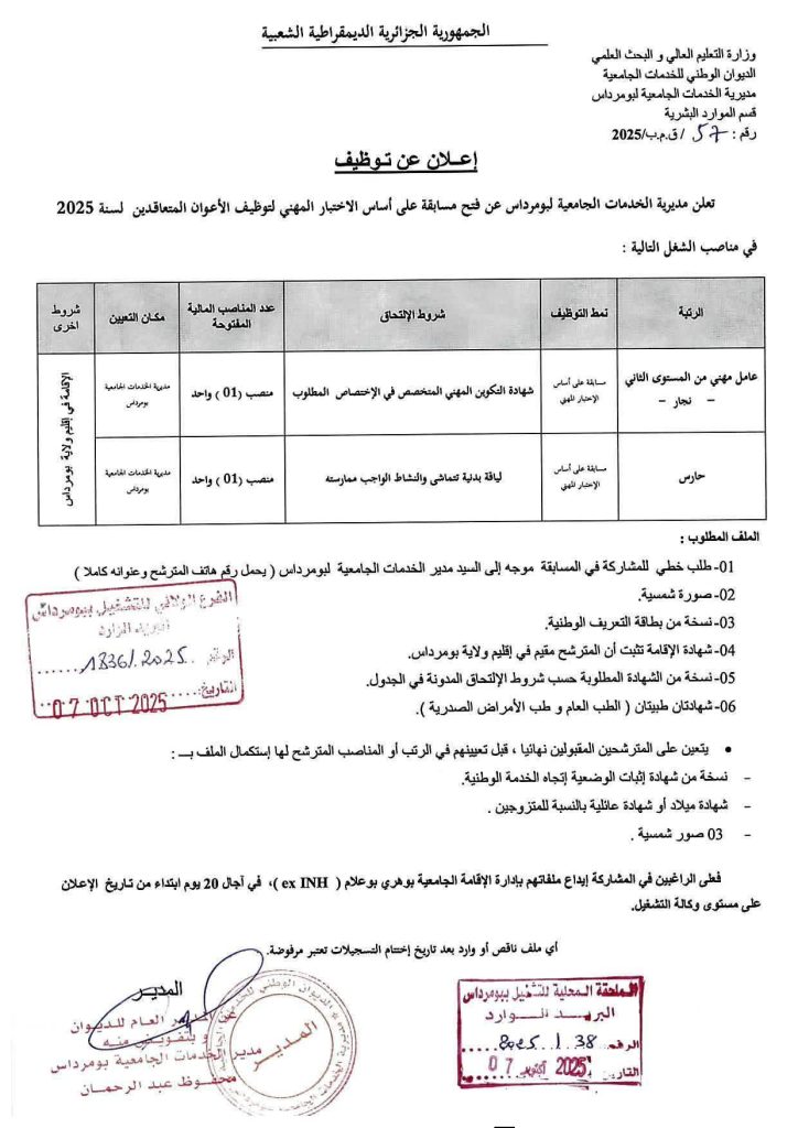تعلن مديرية الخدمات الجامعية لبومرداس عن فتح مسابقة على أساس اختبار للالتحاق للتوظيف لمختلف الأعوان المتعاقدين لسنة 2025 في المناصب الشغل التالية: