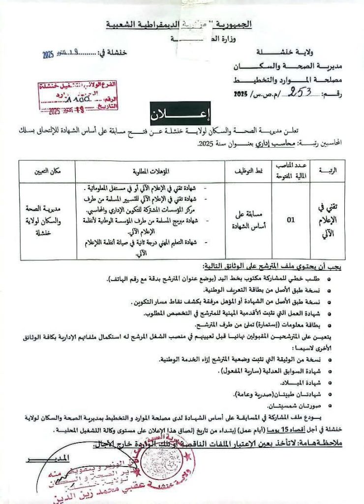 تقني في الإعلام الآلـي | 01 | مسابقة على أساس الشهادة | – شهادة تقني في الإعلام الآلي أو في مسجل المعاينة. – شهادة تقني في الإعلام الآلي المسلمة من طرف مركز المؤسسات المتحركة للتكوين الإداري والمهني، شهادة مبرمج المسلمة من طرف المؤسسة الوطنية لأنظمة الإعلام الآلي. – شهادة التعليم المهني درجة ثانية في صيانة أنظمة الإعلام الآلي. | مديرية الصحة والسكان لولاية خنشلة |