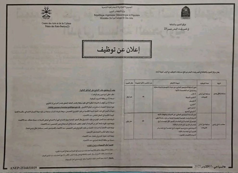 اعلان عن مسابقة توظيف بمركز الفنون والثقافة في قصر رؤساء البحر – حصن 23