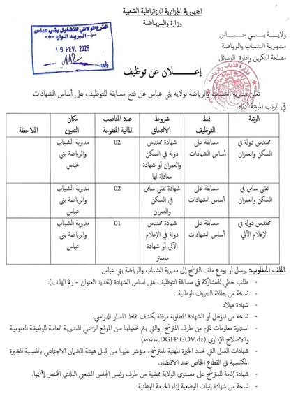 تعلن مديرية الشباب والرياضة لولاية بني عباس عن فتح مسابقة للتوظيف على أساس الشهادات في الرتب المبينة أدناه: