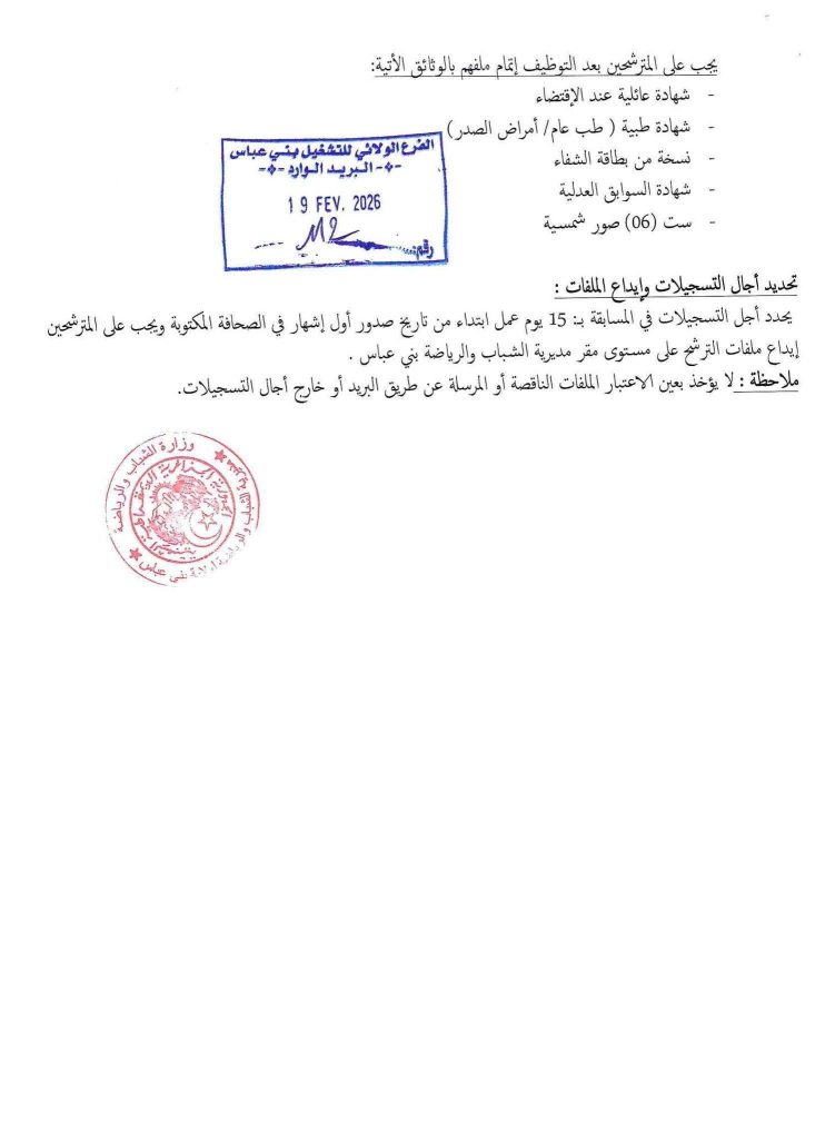 يحدد أجل التسجيلات في المسابقة بـ: 15 يوم عمل ابتداءً من تاريخ صدور أول إشهار في الصحافة المكتوبة ويجب على المترشحين إيداع ملفات الترشح على مستوى مقر مديرية الشباب والرياضة بني عباس.