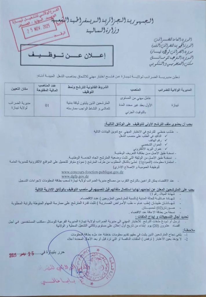 01مديرية الضرائب لولاية تيبازةمديرية الضرائب لولاية تيبازةعامل مهني من المستوى الأول