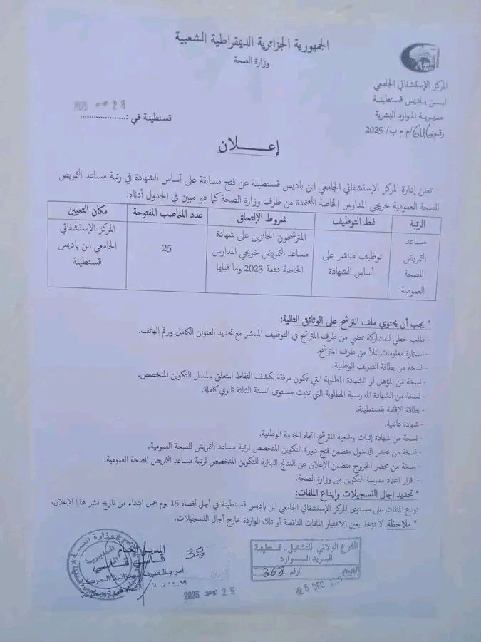 مساعد التمريض للصحة العموميةتوظيف مباشر على أساس الشهادةالمترشحون الحائزون على شهادة مساعد التمريض خريجي المدارس الخاصة دفعة 2023 وما قبلها25المركز الاستشفائي الجامعي ابن باديس قسنطينة