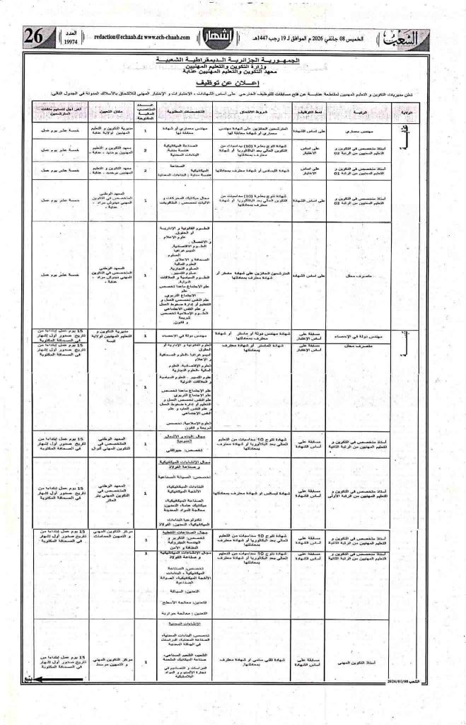 اعلان عن مسابقة لتوظيف أساتذة وإداريين بوزارة التكوين المهني والتمهين في عدة ولايات