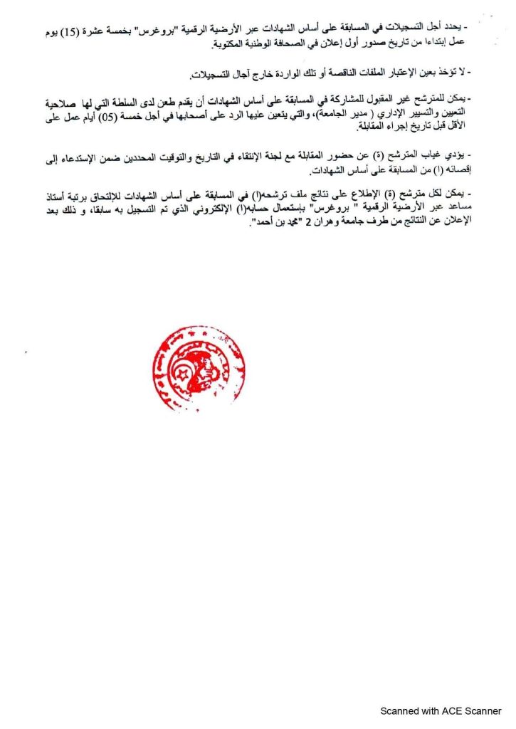 يتم إيداع الملفات حصريا عبر المنصة الرقمية: https://progres.mesrs.dz/webrecrutement/