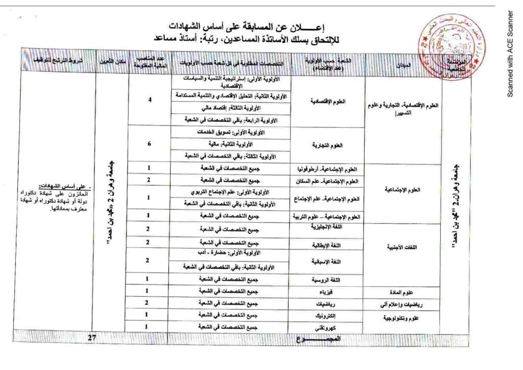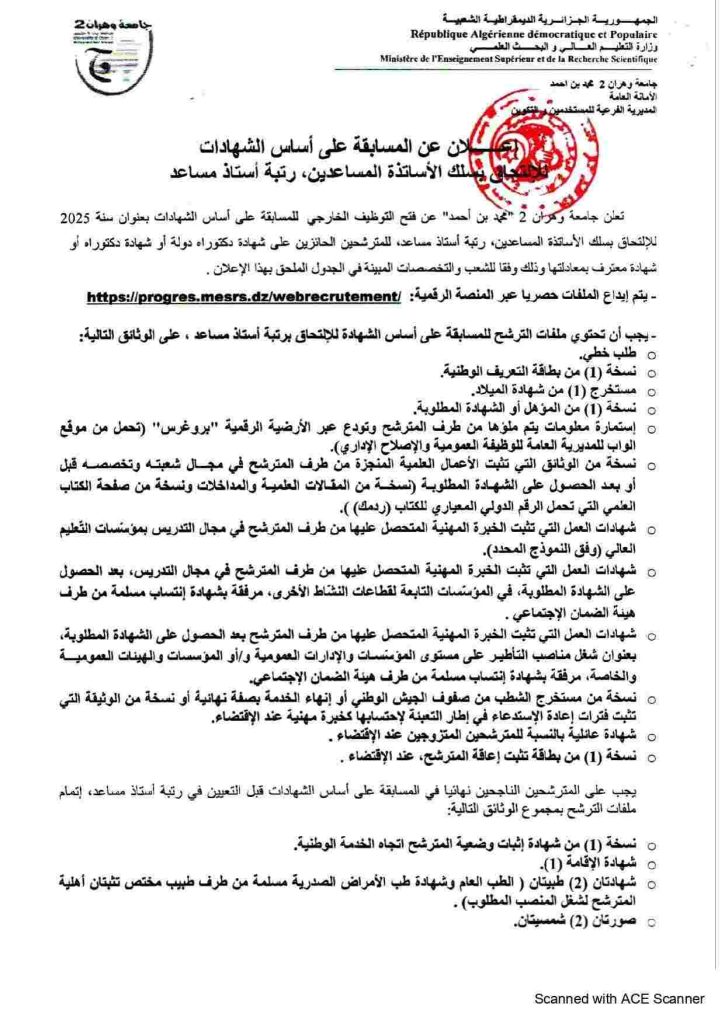 تعلن جامعة وهران 2 “محمد بن أحمد” عن فتح التوظيف الخارجي للمسابقة على أساس الشهادات بعنوان سنة 2025 للالتحاق بسلك الأساتذة المساعدين، رتبة أستاذ مساعد، للمترشحين الحائزين على شهادة دكتوراه دولة أو شهادة دكتوراه أو شهادة معترف بمعادلتها وذلك وفقا للشعب والتخصصات المبينة في الجدول الملحق بهذا الإعلان.