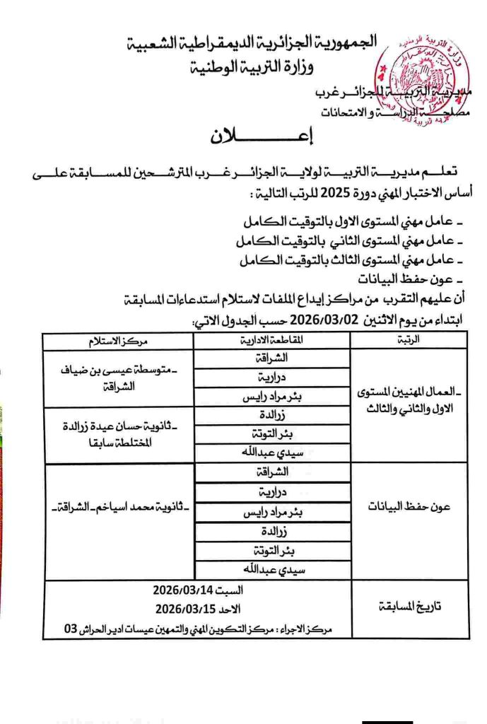 تعلم مديرية التربية لولاية الجزائر غرب المترشحين للمسابقة على أساس الاختبار المهني دورة 2025 للرتب التالية:
