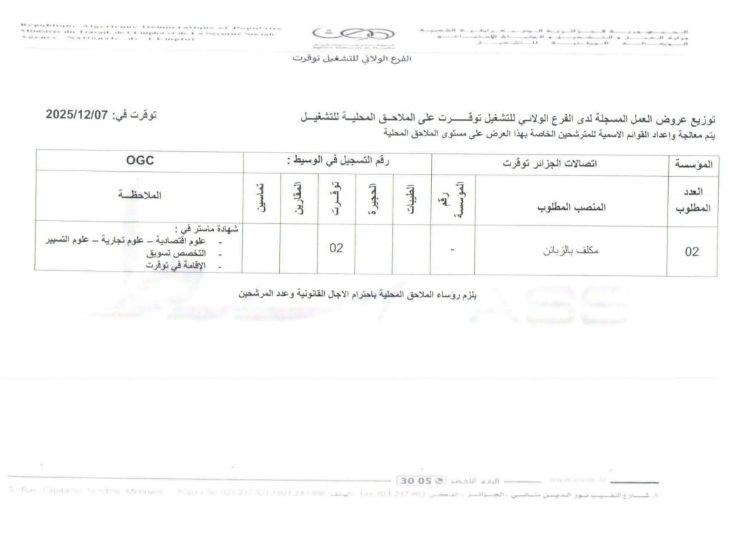توزيع عروض العمل المسجلة لدى الفرع الولائي للتشغيل توقرت على الملاحق المحلية للتشغيل