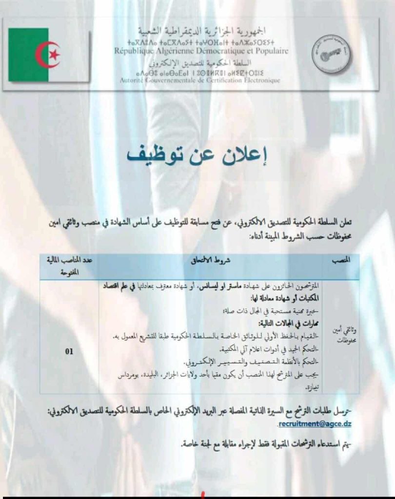 تعلن السلطة الحكومية للتصديق الإلكتروني، عن فتح مسابقة للتوظيف على أساس الشهادة في منصب وثائقي أمين محفوظات حسب الشروط المبينة أدناه: