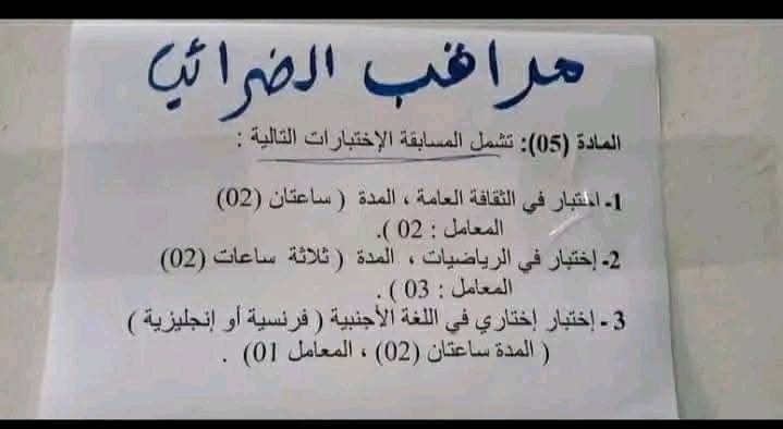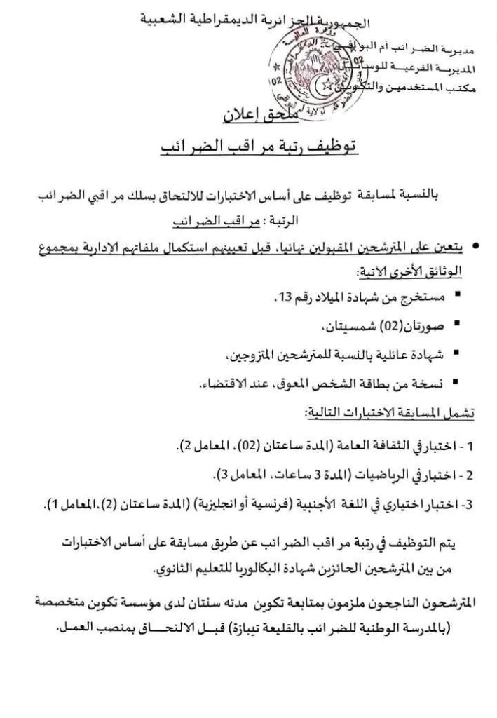 ملاحظة: المترشحون الناجحون سيستفيدون من تكوين تخصصي لمدة سنتين على مستوى المدرسة الوطنية للضرائب بالقليعة – تيبازة، ويشمل ذلك الذكور والإناث.