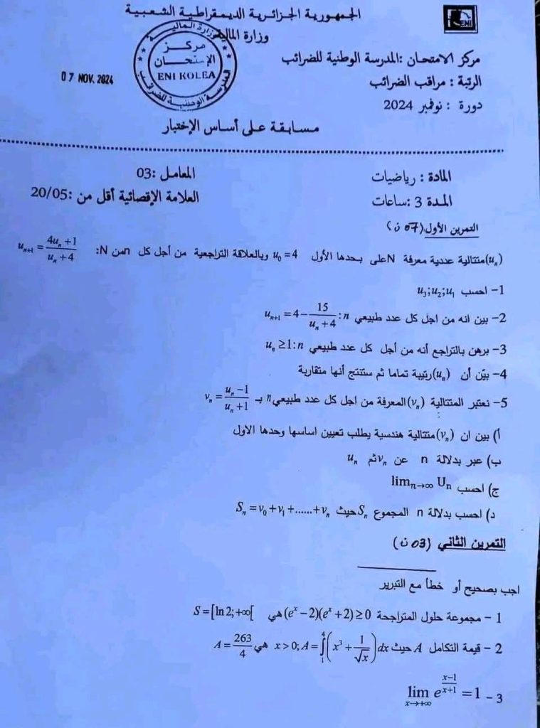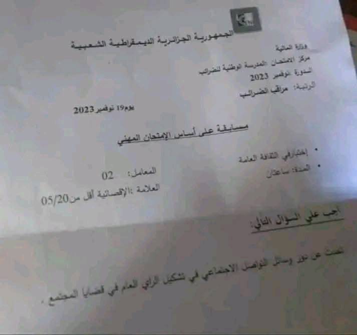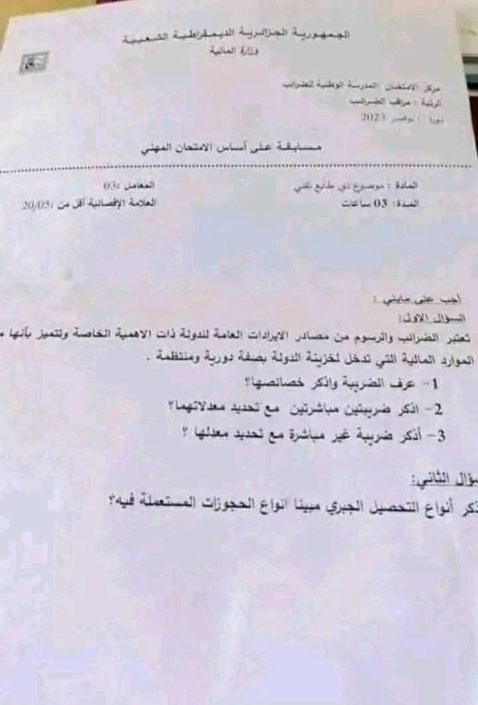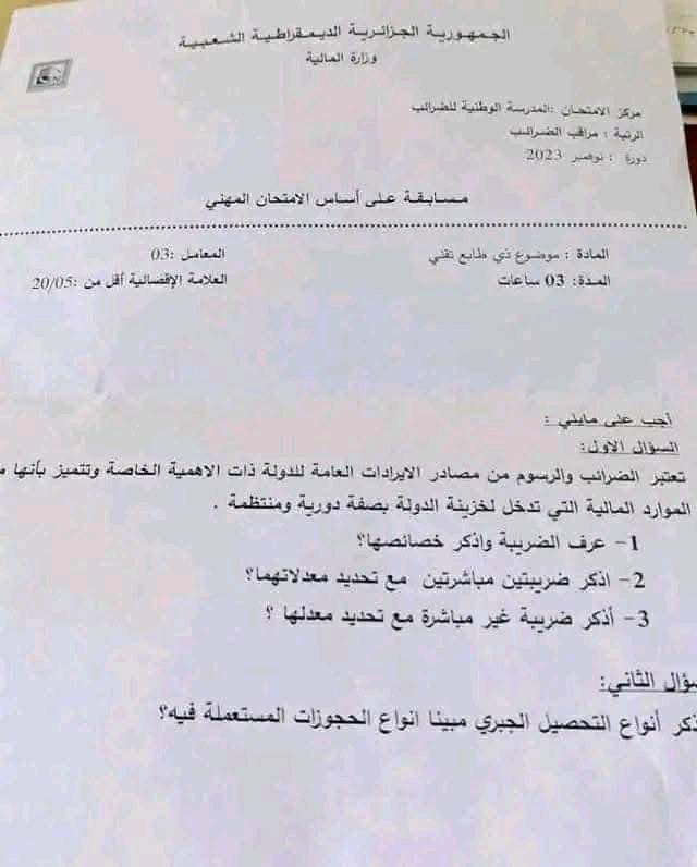 للمقبلين على مسابقة مديرية الضرائب إليكم بعض نماذج المسابقات السابقة الخاصة برتبة مراقب ضرائب حتى تتكوّن لديكم فكرة عن طبيعة الأسئلة وطريقة التحضير.