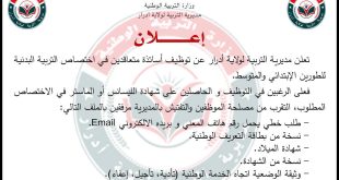 وزارة التربية الوطنية مديرية التربية لولاية أدرار ads إعــــلان تعلن مديرية التربية لولاية أدرار عن توظيف أساتذة متعاقدين في اختصاص التربية البدنية للطورين الإبتدائي والمتوسط. فعلى الراغبين في التوظيف والحاصلين على شهادة الليسانس أو الماستر في الاختصاص المطلوب، التقرب من مصلحة الموظفين والتفتيش بالمديرية …