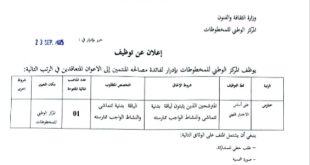 وزارة الثقافة والفنون المركز الوطني للمخطوطات ads إعلان عن توظيف يوظف المركز الوطني للمخطوطات بأدرار لفائدة مصالحه المنتمين إلى الأعوان المتعاقدين في الرتب التالية: الرتبةنمط التوظيفشروط التوظيفشروط الإلتحاقالتخصص المطلوبعدد المناصبمكان التعيينشروط أخرىحارسعلى أساس الإختبار المهنياللياقة البدنية والنشاط الواجب ممارستهللمرشحين الذين يتمتعون بلياقة بدنية تمكنهم …