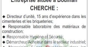 اعلان توظيف ads شركة تقع في بوعينان بولاية البليدة تبحث عن : مدير وحدة، خبرة 15 سنة في معامل الإسمنت والطوب؛ مسؤول مخبر مواد البناء؛ مسؤول النظافة والأمن؛ مكلف بالشراء/مقتني في القطاع الصناعي؛ أمين مخزن، خبرة 5 سنوات في مخازن قطع الغيار الصناعية؛ رئيس …