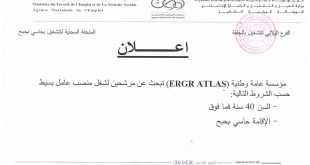 الجمهورية الجزائرية الديمقراطية الشعبية وزارة العمل والتشغيل والضمان الاجتماعي الوكالة الوطنية للتشغيل الفرع الولائي للتشغيل بالجلفة الملحقة المحلية للتشغيل بحاسي بحبح ads إعلان مؤسسة عامة وطنية (ERGR ATLAS) تبحث عن مرشحين لشغل منصب عامل بسيط حسب الشروط التالية: السن 40 سنة فما فوق الإقامة …