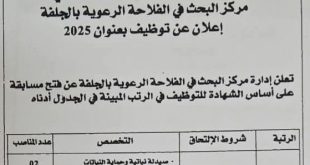 أكمل القراءة »إعلان عن توظيف بعنوان 2025 بمركز البحث في الفلاحة الرعوية