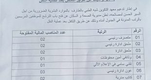 إعلان توظيف عن طريق التكفل بعد عملية النقل معهد التكوين شبه الطبي زوبية بوبكر الطارف مديرية الصحة و السكان لولاية الطارف ads في إطار تدعيم معهد التكوين شبه الطبي بالطارف بالموارد البشرية الضرورية من اجل السير الحسن لمصالحه، تعلن مديرية الصحة و السكان عن …