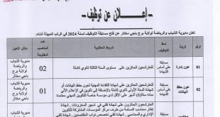 إعلان عن توظيف المؤسسة العمومية للصحة الجوارية ببرج باجي مختار ads المؤسسة العمومية للصحة الجوارية ببرج باجي مختار تعلن عن فتح مسابقات للتوظيف في الرتب المبينة أدناه: الرتبةالشروط الأخرىمكان التعيينعدد المناصبالتخصص المطلوبنمط التوظيفعامل مهني من المستوى الأوللياقة بدنية تتماشى والنشاط الواجب ممارستهالعيادة المتعددة الخدمات …