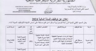الجمهورية الجزائرية الديمقراطية الشعبية وزارة الفلاحة والتنمية الريفية المعهد التقني لتنمية الزراعة الصحراوية بسكرة ads إعلان عن فتح مسابقة للوظيف العمومية لسنة 2024 يعلن المعهد التقني لتنمية الزراعة الصحراوية بسكرة عن فتح مسابقة على أساس الشهادة للتوظيف المبينة أدناه: إعلان عن توظيف بالمجلس الأعلى …