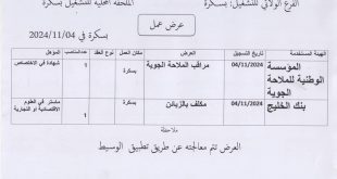 الجمهورية الجزائرية الديمقراطية الشعبية وزارة العمل والتشغيل والضمان الاجتماعي الوكالة الوطنية للتشغيل ads الملحقة المحلية للتشغيل بسكرة الفرع الولائي للتشغيل: بسكرة عروض عمل بسكرة في 31/10/2024 الميول المهنيةتاريخ النشرالعرضعدد المناصبنوع العقدمكان العملالمؤهلاتمؤسسة تسيير المطارات بسكرة31/10/2024تقني سامي في تسيير المخزون01بسكرةخبرة 3 سنوات ملاحظة: العرض تتم …