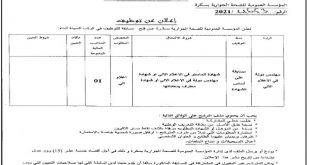 تعلن المؤسسة العمومية للصحة الجوارية بسكرة عن فتح مسابقة توظيف على اساس الشهادات في المناصب التالية ads مهندس دولة في الاعلام الالي عدد المناصب 01 نمط التوظيف مسابقة على اساس الشهادة تاريخ نشر الاعلان : 28 ديسمبر 2021 اخر اجل لايداع الملفات 15 يوم …