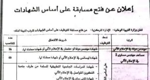وزارة التربية الوطنية المديرية العامة للموارد البشرية والتكوين مديرية الموارد البشرية ads إعلان عن فتح مسابقة على أساس الشهادات تعلن وزارة التربية الوطنية – الإدارة المركزية- عن فتح مسابقة للتوظيف على أساس الشهادات للرتب المبينة أدناه: الرتبةنمط التوظيفشروط الالتحاقعدد المناصبمهندس دولة في الإعلام الآليعلى …