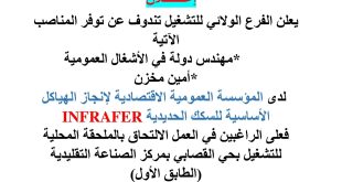 وزارة العمل والتشغيل والضمان الاجتماعي الوكالة الوطنية للتشغيل مديرية التشغيل والوكالة المحلية للتشغيل تندوف – أم العسل ads إعلان هام تبعًا لعرض العمل الوارد إلى مصالحنا من طرف المديرية العامة للشركة الوطنية للنقل بالسكك الحديدية (SNTF) والمتضمن (300) منصب شغل في عدة تخصصات، وذلك …