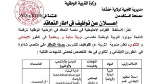 أكمل القراءة »إعــلان عن توظيف في إطار التعاقد على مناصب شاغرة في الطورين الابتدائي و الثانوي