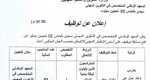 إعلان عن توظيف بالمعهد الوطني المتخصص في التكوين المهني سيدي بلعباس 02