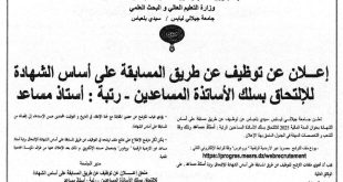 وزارة التعليم العالي والبحث العلمي جامعة جيلالي اليابس – سيدي بلعباس ads إعلان توظيف عن طريق المسابقة على أساس الشهادة للإلتحاق بسلك الأساتذة المساعدين – رتبة : أستاذ مساعد تعلن جامعة جيلالي اليابس – سيدي بلعباس ، عن توظيف عن طريق المسابقة على أساس …